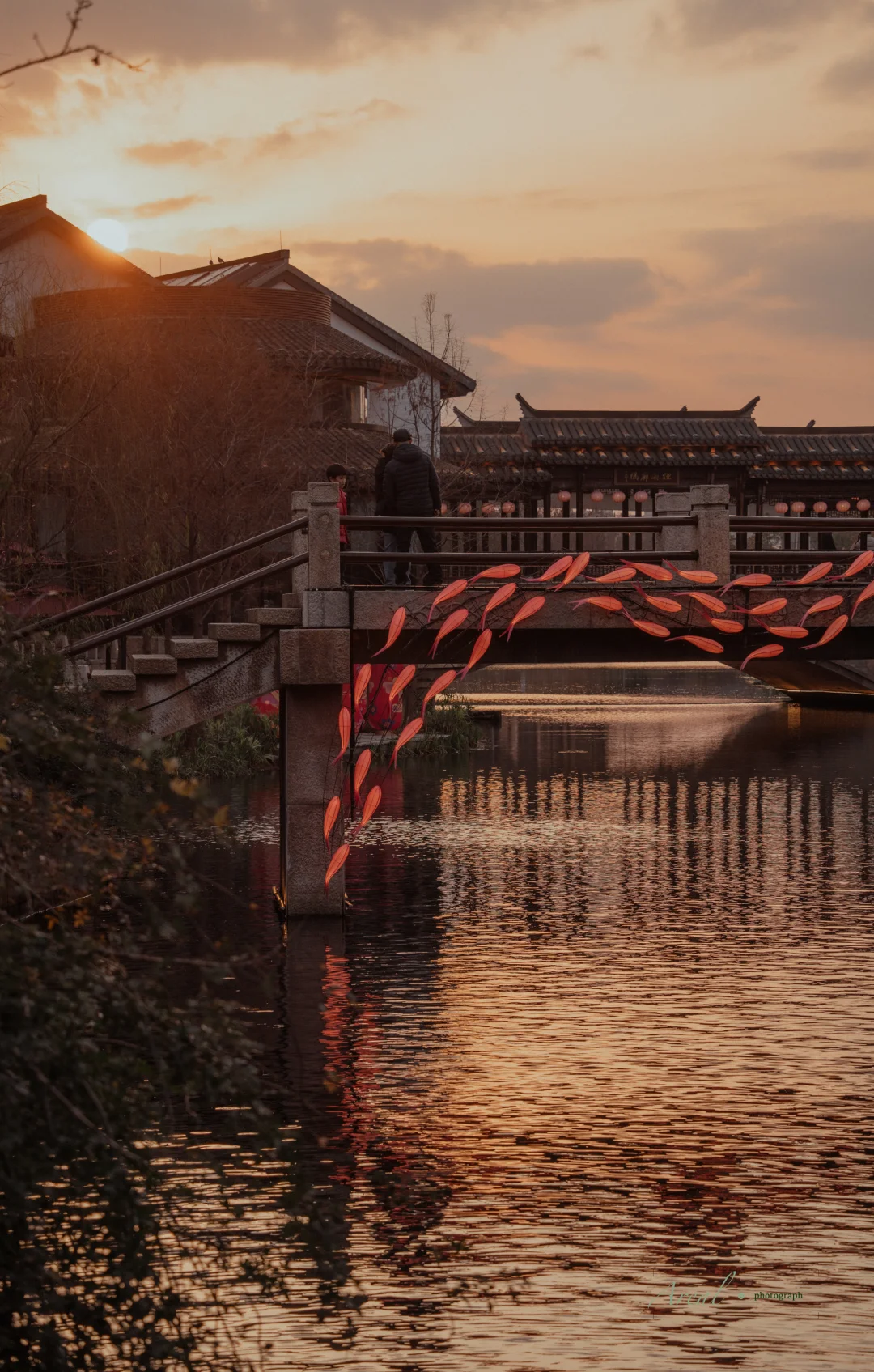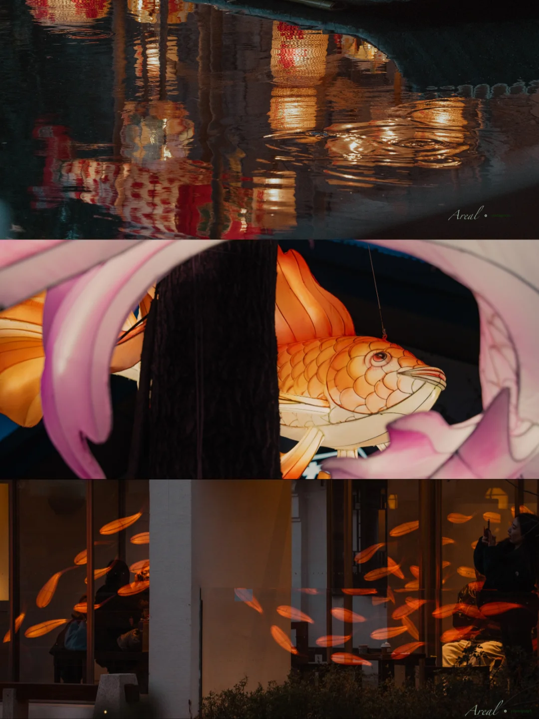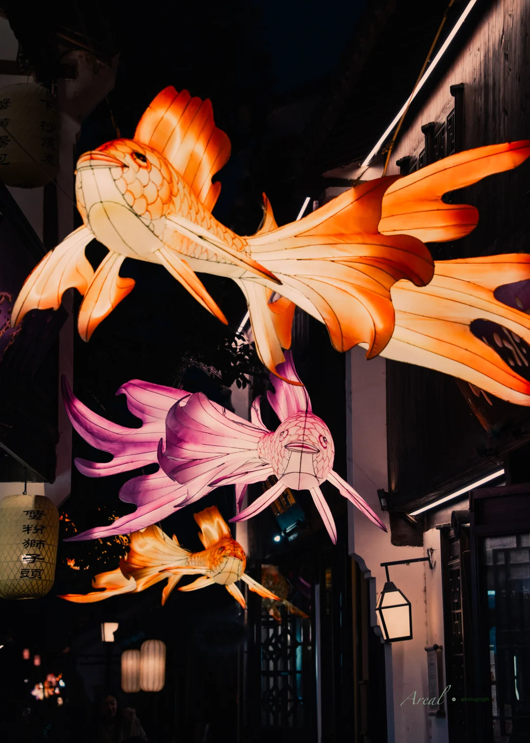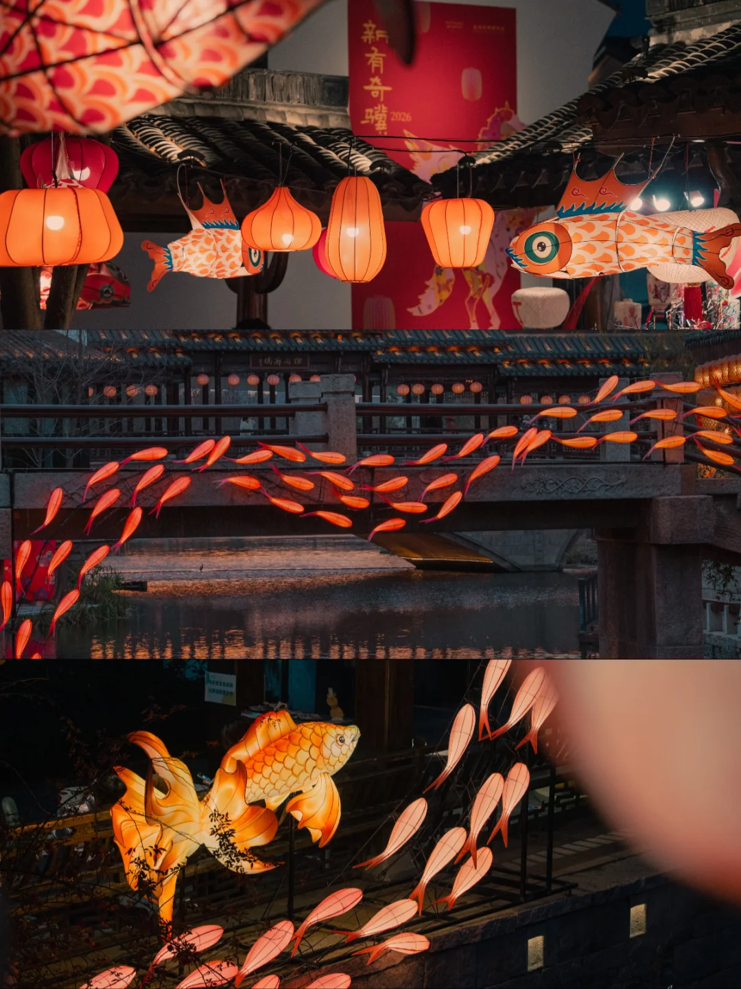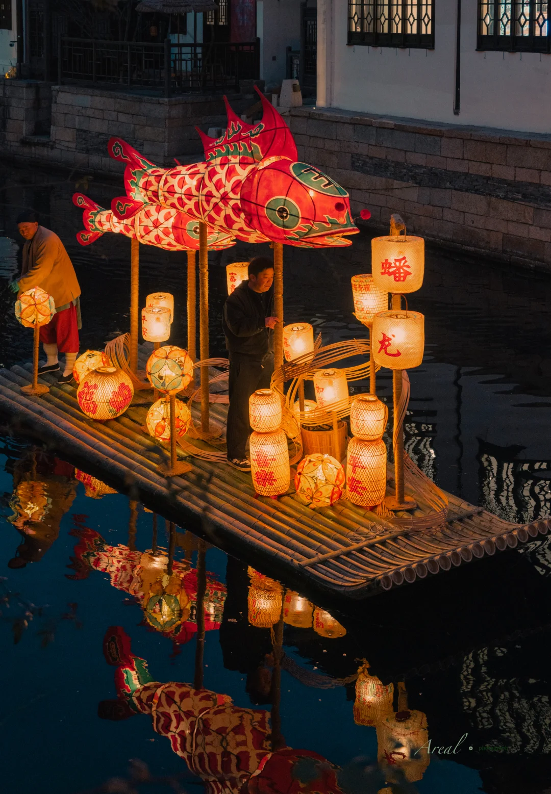 ⭕️水曲桥→南墅泾码头:拍「鱼灯竹筏」,青瓦白墙作背景,动态感拉满;