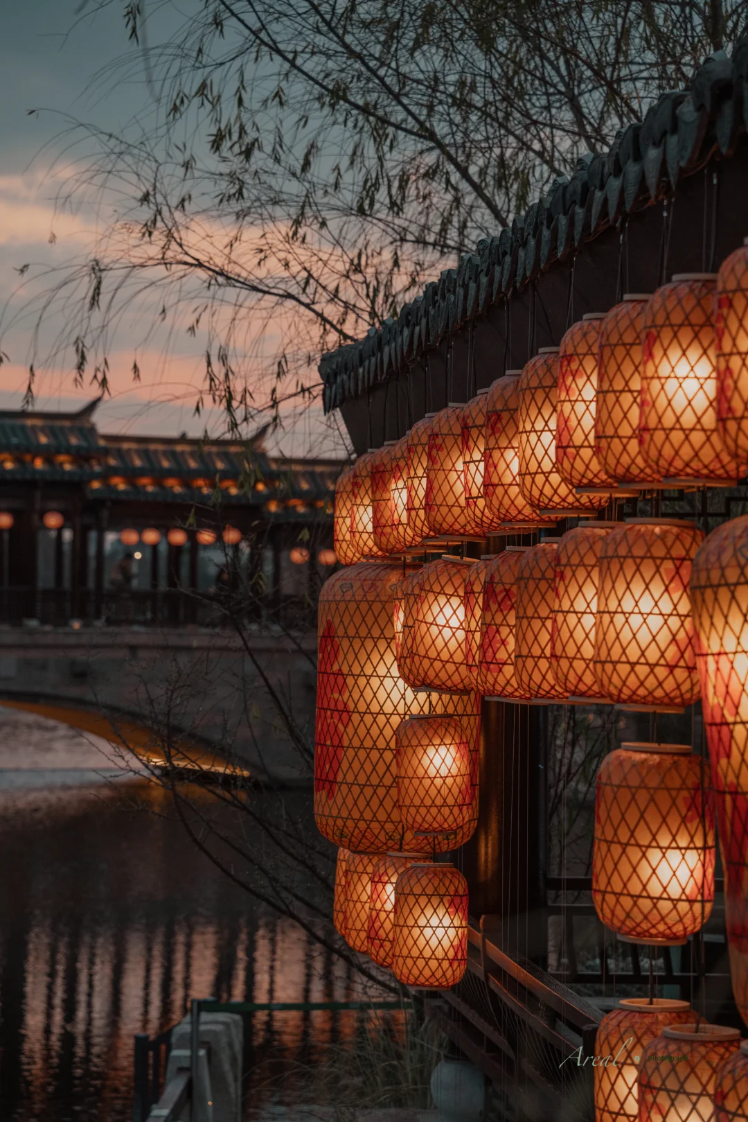 ⭕️涵春广场:仰拍马纹灯笼 + 祈福铃铛,暖光自动补光,特写 / 半身照都绝;