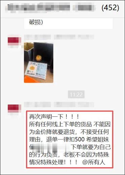 记者发现,有黄金品牌柜姐在社群中发布声明称:不能因为金价降了就要退货,不接受任何理由,退单一律扣500元。柜姐提醒称:“下单要为自己的行为负责,老板不会因为特殊情况特殊处理。”