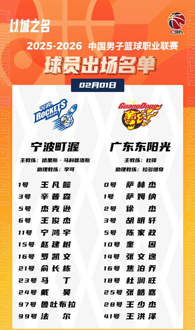 虎扑02月01日讯今日CBA常规赛,宁波对阵广东的大名单已经公布。