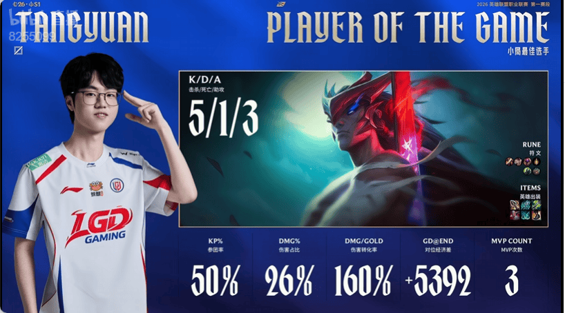 Tangyuan永恩打出5/1/3战绩,拿到LNG对阵LGD次局比赛MVP