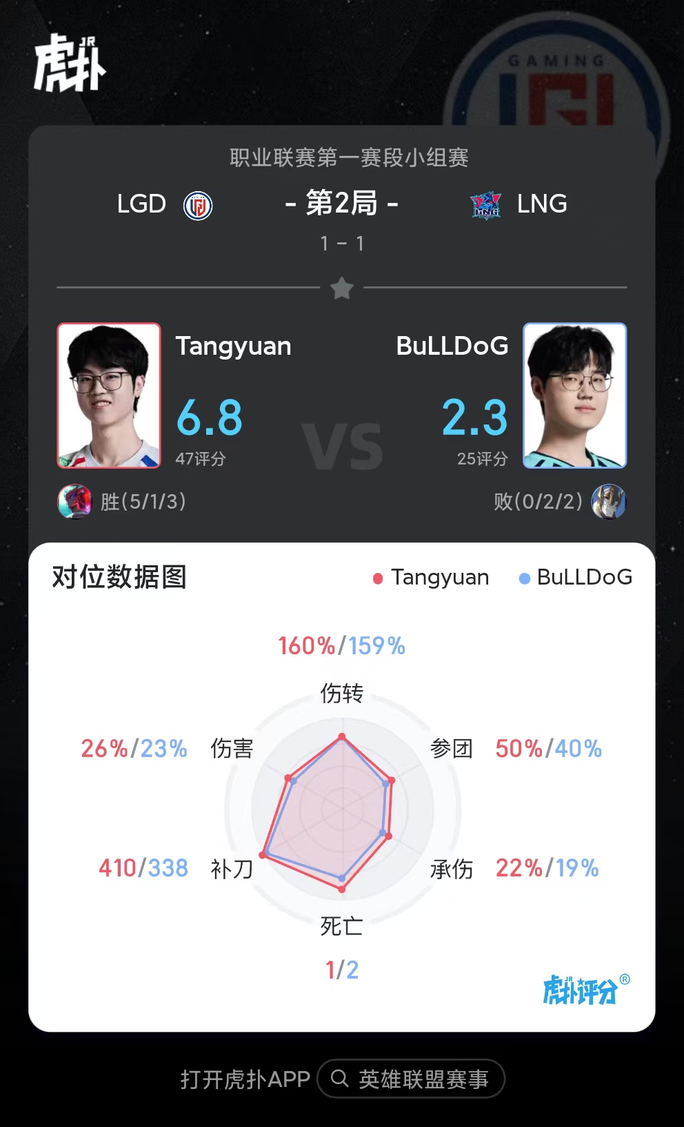 虎扑02月01日讯Tangyuan永恩打出5/1/3战绩,拿到LNG对阵LGD次局比赛MVP