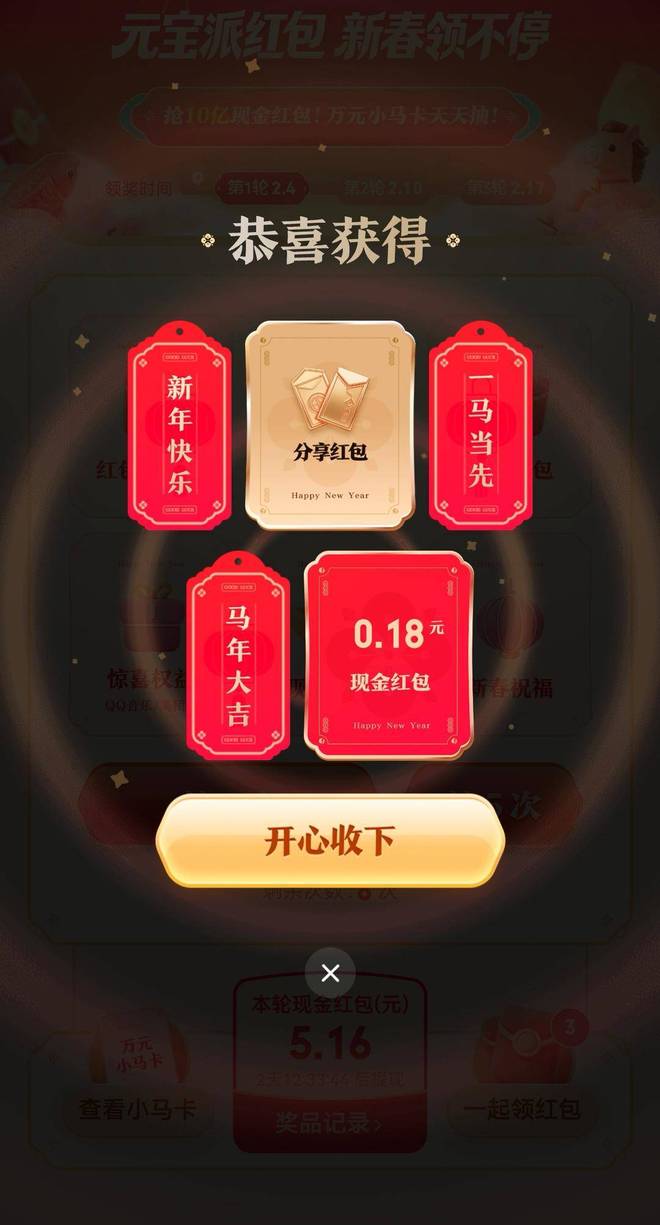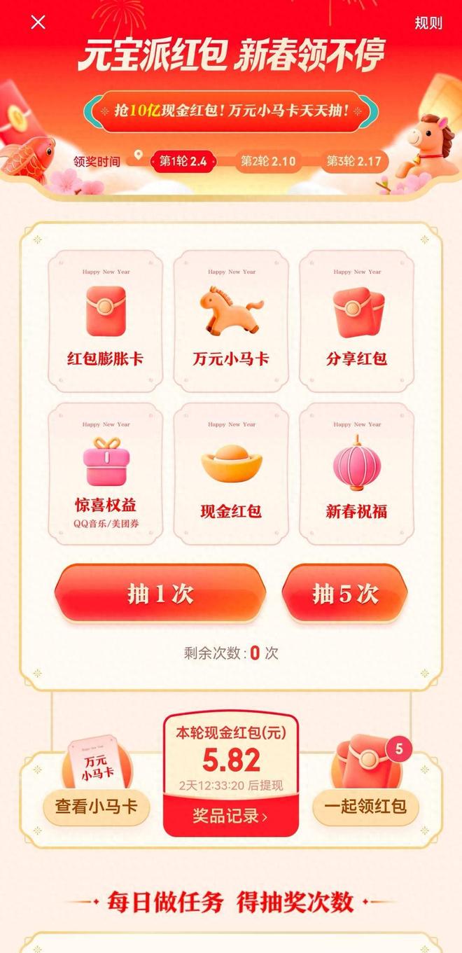 扬子晚报/紫牛新闻记者了解到,腾讯元宝红包活动设置了万元小马卡、现金红包和分享红包等红包形态。用户每天登录元宝App可领现金红包,做任务则可抽更多红包,最诱人的是,有几率抽中限量100张的价值1万元现金小马卡。