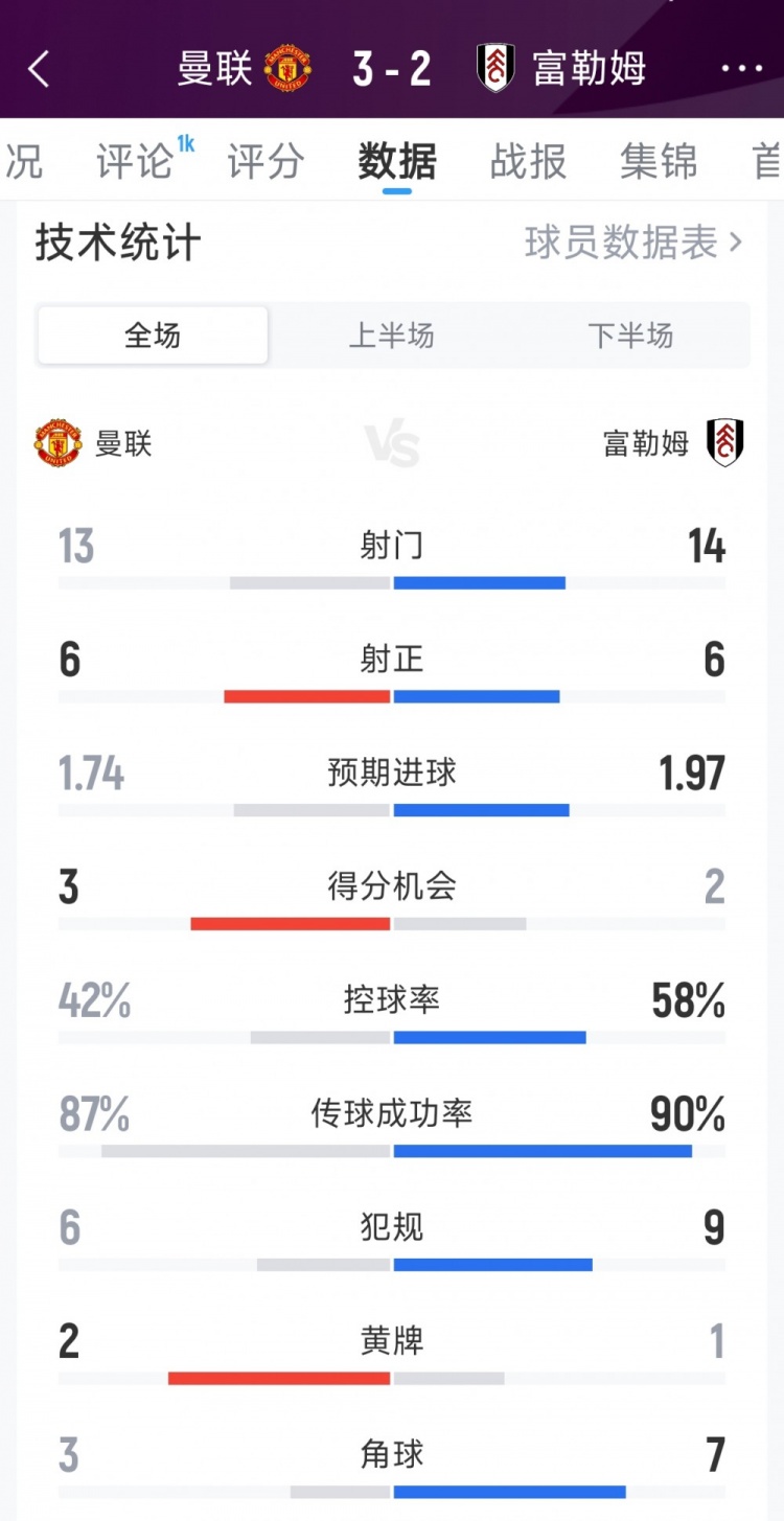 直播吧2月1日讯在本轮英超,曼联3-2击败富勒姆,以下为双方全场数据对比: