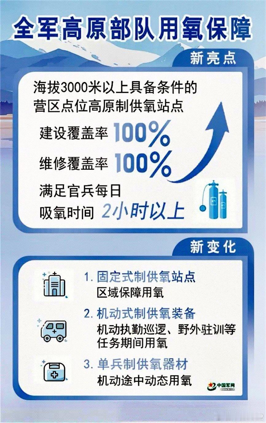 高原用氧已经全覆盖为方便官兵在机动执勤巡逻、野外驻训等任务期间用氧,有关部门为部队配备制氧方舱、高原制氧车等装备;针对官兵机动途中动态用氧需求,配备单兵制供氧器材,高原部队用氧保障从“救命氧”“保健氧”向“常态氧”“战斗氧”拓展。以固定式制供氧站点为区域支点、机动式制供氧装备为支撑、单兵制供氧器材为一线补充,点面结合、阶梯辐射的我军高原制供氧保障体系基本建成。全军高原制供氧保障能力实现整体跨越,为高原部队官兵健康守防、练兵备战提供坚强保障!