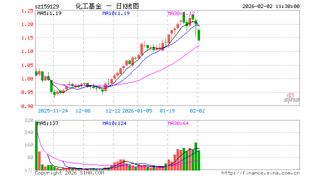2月2日,截止午间收盘,化工ETF嘉实(159129)跌5.01%,报1.137元,成交额1.45亿元。化工ETF嘉实(159129)重仓股方面,天赐材料截止午盘涨0.25%,万华化学跌7.18%,盐湖股份跌1.62%,巨化股份跌3.15%,藏格矿业跌3.16%,云天化跌6.00%,宝丰能源跌7.83%,金发科技跌2.46%,恒力石化跌7.43%,新宙邦跌2.65%。