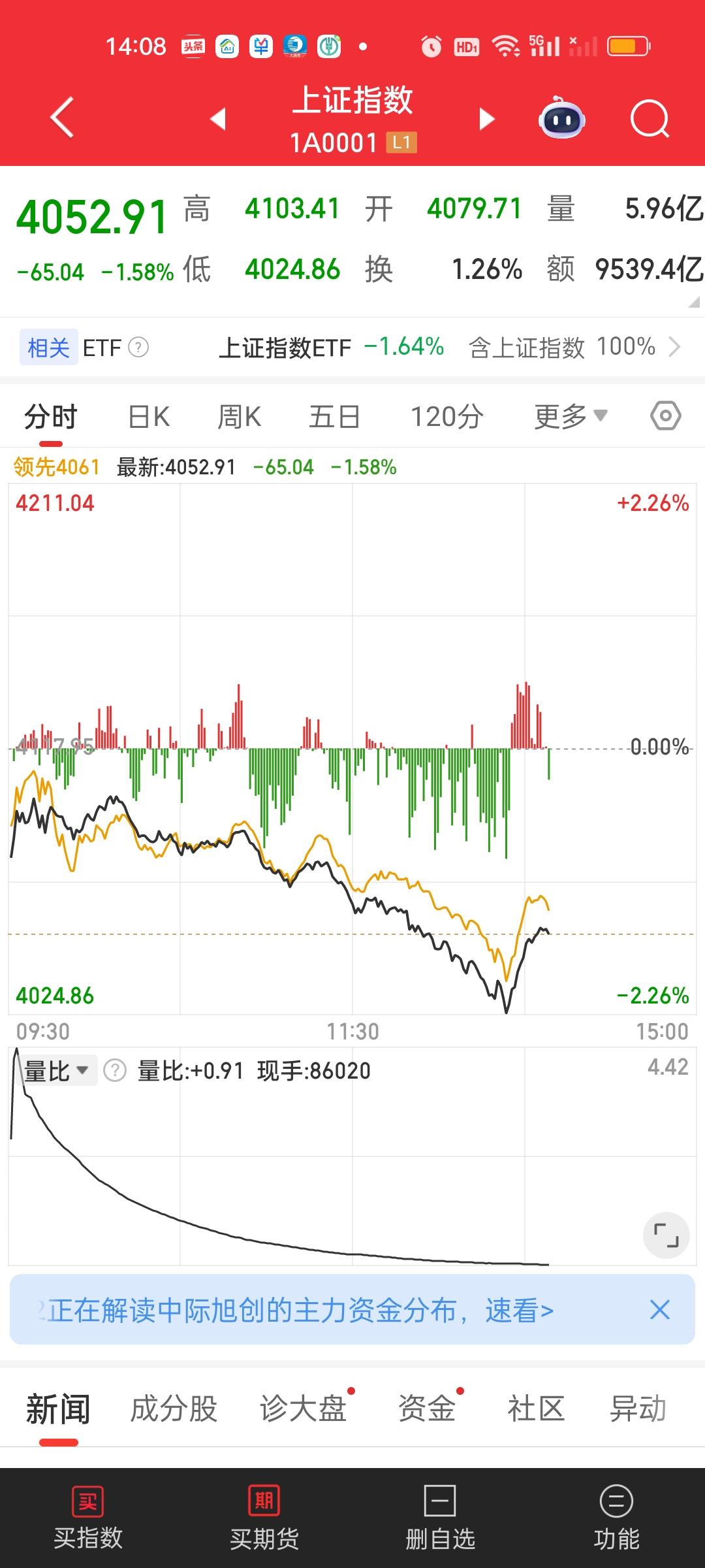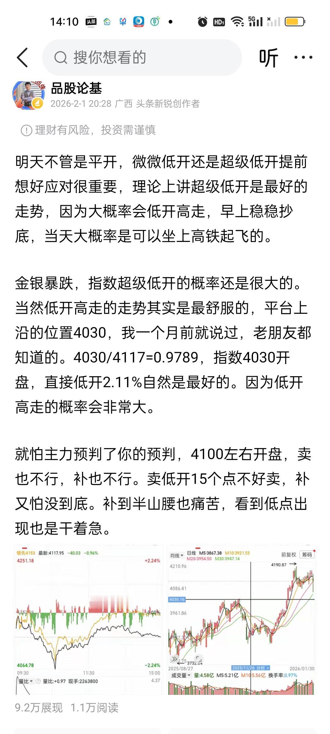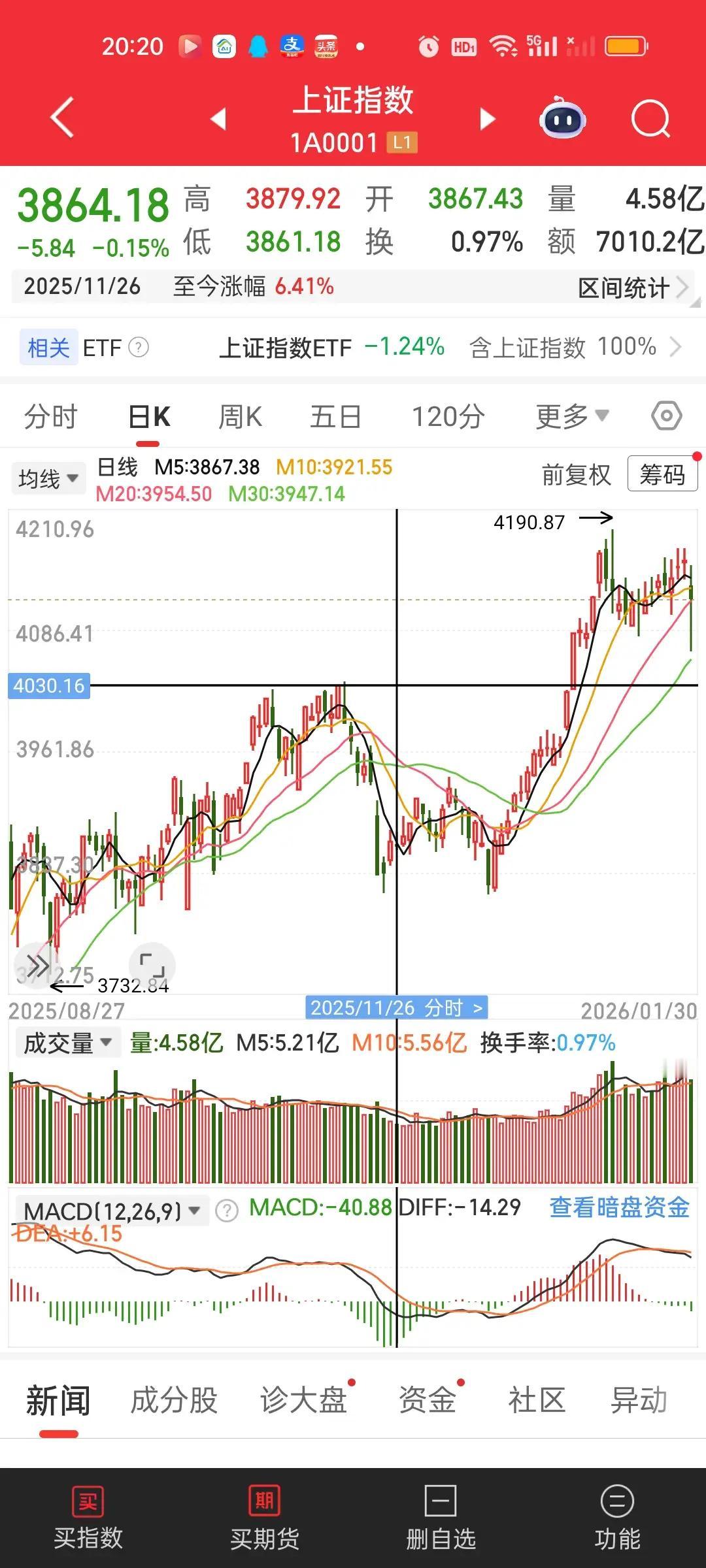 今天表现并不好。场内证券账户亏了30多元,主要原因还是加仓太急了,导致加到了高位,买的成本太高了。平台上沿4130破了一点,加仓加的太快。4139点就加满了,结果最低到了4124点。没有任何办法。我多次强调过会打到平台下沿4130点。可是没办法完全精确到点位。