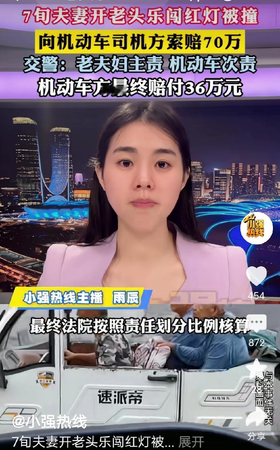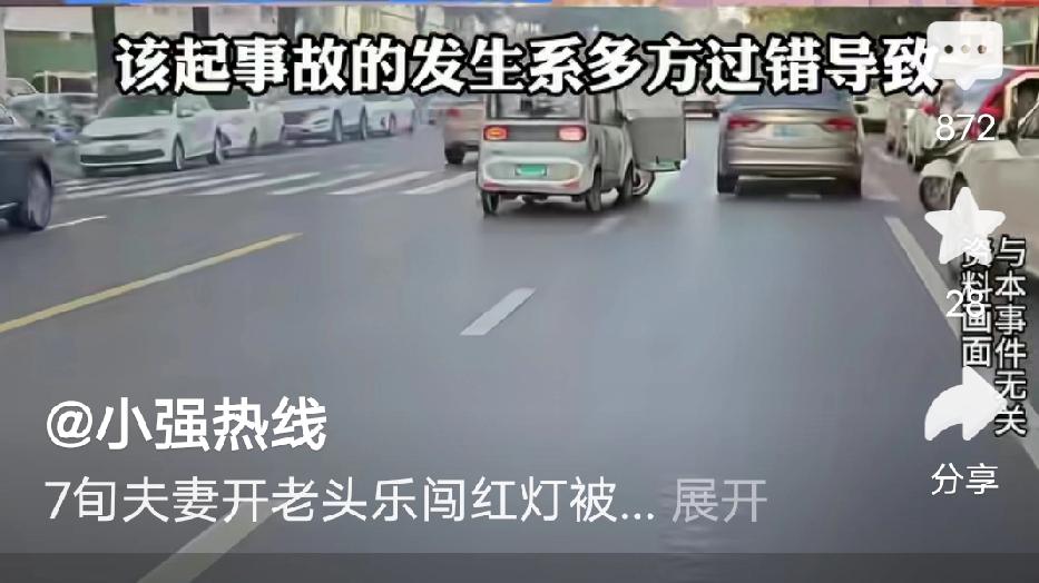 太气人了!七旬老夫妇驾驶三无“老头乐”闯红灯,与正常行驶的轿车相撞,反倒状告司机及保险公司索赔70余万,法院最终判决却争议不断! 网友: 守规矩的人平白买单,这结果任谁看了都得憋一肚子火! 上海一早,沈大妈开着自家的“老头乐”,载着老伴黄大爷去附近菜市场置办食材,本来是件日常出门的小事,谁料却酿了祸。两人慢悠悠行驶到一个十字路口,沈大妈压根没留意路口的交通信号灯已经跳成红灯,凭着自己的习惯径直踩着电门就冲了过去,恰好撞上了绿灯正常通行的轿车,两车狠狠相撞发出巨响,那动静隔着老远都能听见。“老头乐”当场被撞得歪在一边,车身多处凹陷,沈大妈和黄大爷猝不及防从车上晃下来,摔在路面上疼得直咧嘴,两人胳膊、腿部多处骨折,而正常行驶的轿车前脸撞得稀碎,车灯、保险杠全坏了,车头还蹭出大片划痕,司机也是吓出一身冷汗,好好开着车竟遇上这糟心事。 交警赶到现场勘查,很快给出责任认定:沈大妈驾驶的“老头乐”无牌、无证、无保险,属于典型的“三无”车辆,还无视交通规则闯红灯,妥妥的事故主因,负主要责任;黄大爷明知车辆没有合法资质,还坐上车随行,也得担次要责任;轿车司机则因行驶中未做到全面观察路口路况,负次要责任,这“未充分观察”的判定,也让不少人替正常行驶的司机感到委屈! 事后老夫妇俩却将轿车司机及其保险公司告上法庭,以两人受伤治疗、车辆损坏为由,张口就索赔70余万元,这操作属实让人看不懂,自己违规酿的祸,反倒理直气壮要别人赔。 最终法院采信了交警的责任认定结果,判决机动车方赔付老夫妇36万元,这一判决结果一出,瞬间在全网掀起热议,网友们看完集体炸锅,满是不解! - 有网友说:真的太离谱了!自己开三无车闯红灯,撞了之后还能反过来要钱,正常开车,走在路上都得提心吊胆防着各种不守规矩的! - 有网友吐槽:“老头乐”就是马路最大的隐患之一!无牌无证,不少老人开着它闯红灯、逆行、抢道真该好好严查整治,不能再放任了! - 有网友不理解:正常绿灯通行,司机到底有什么错?就因为一句“没充分观察”就要赔36万,闯红灯的一方就该负全责,为自己的违规行为买单,凭什么要让守规矩的人蒙受经济损失还受气? 这个事情,大家怎么看呢? 老头乐闯红灯被撞反索赔 主责方获赔36万 交通责任认定