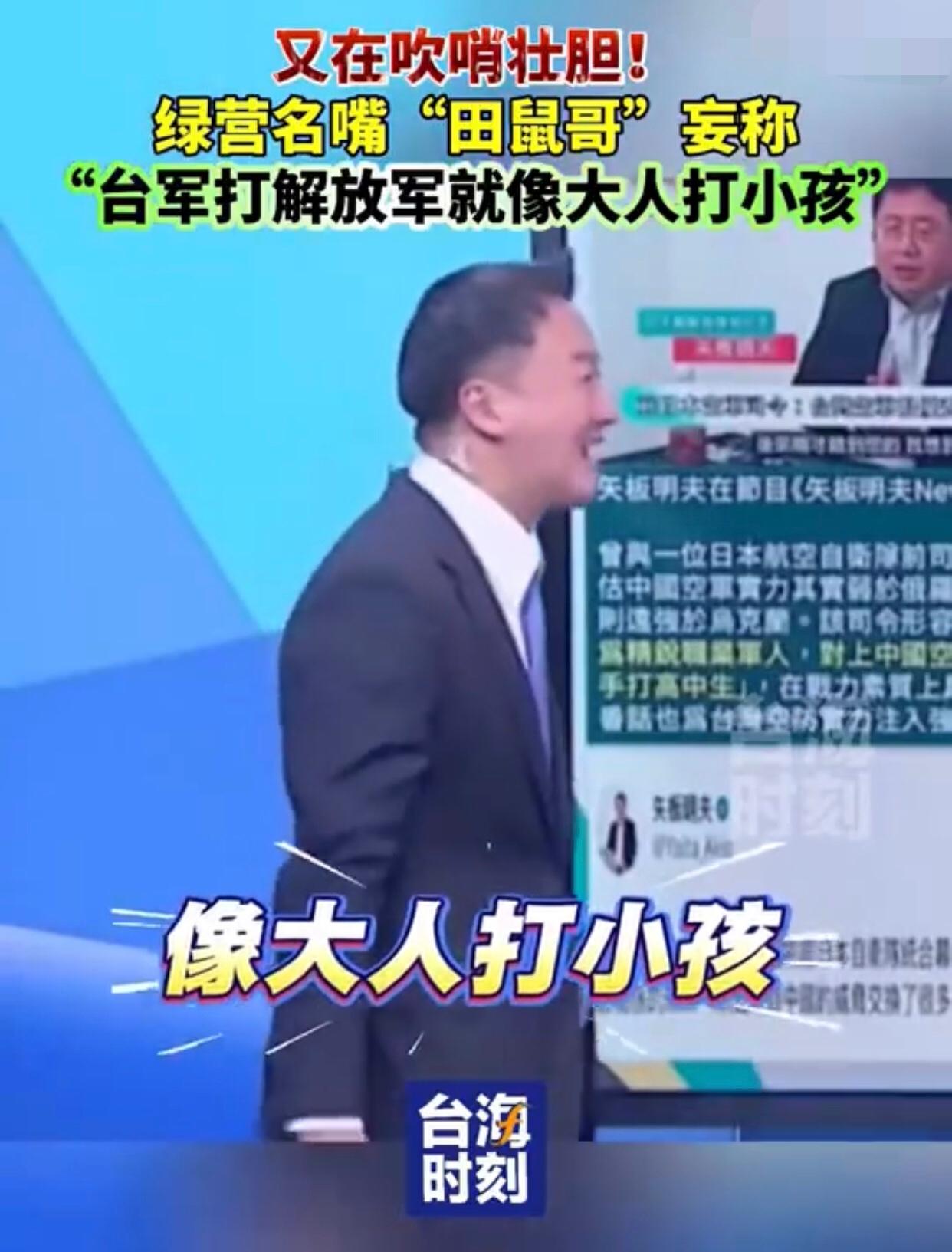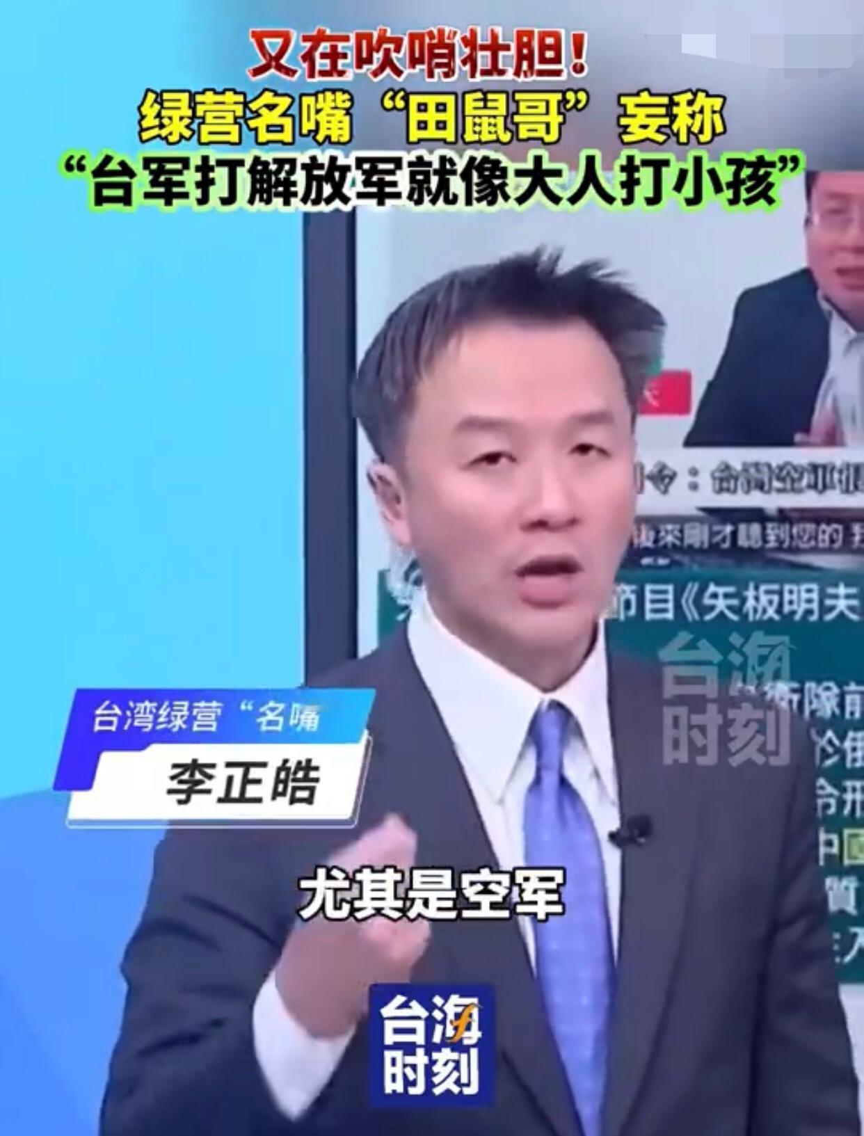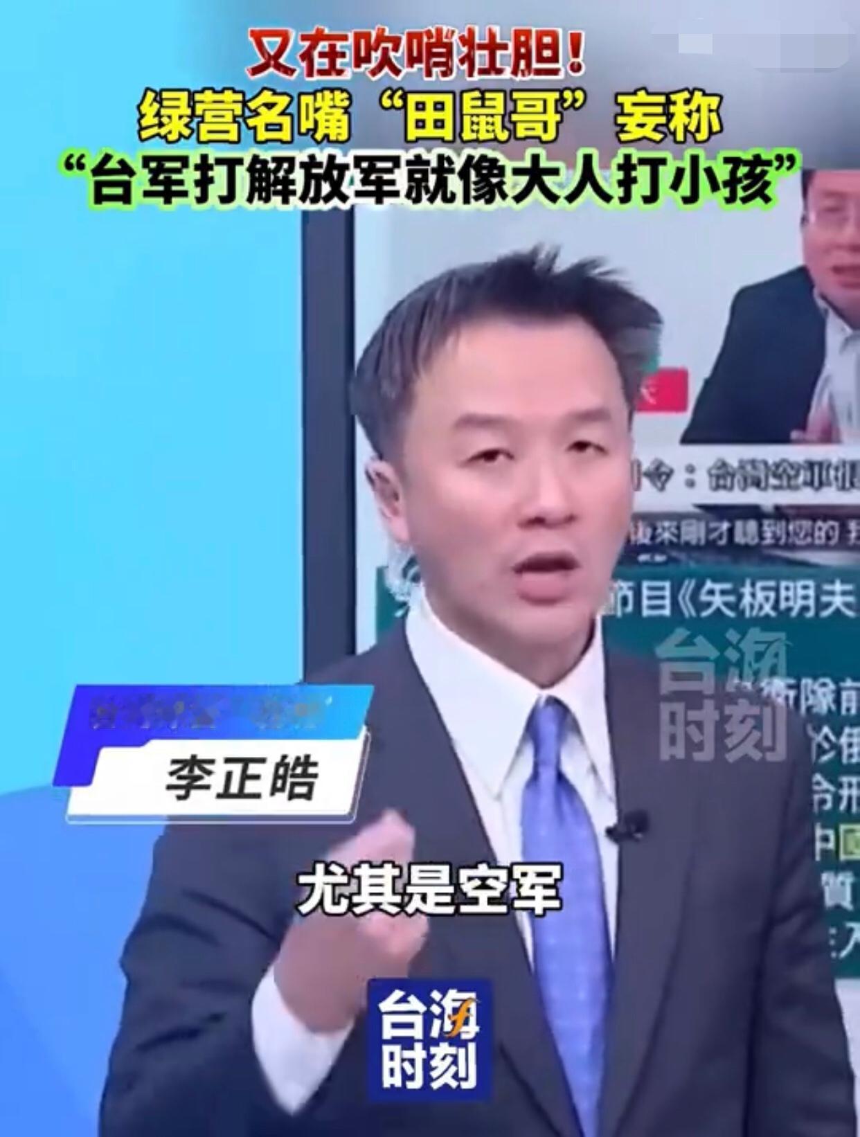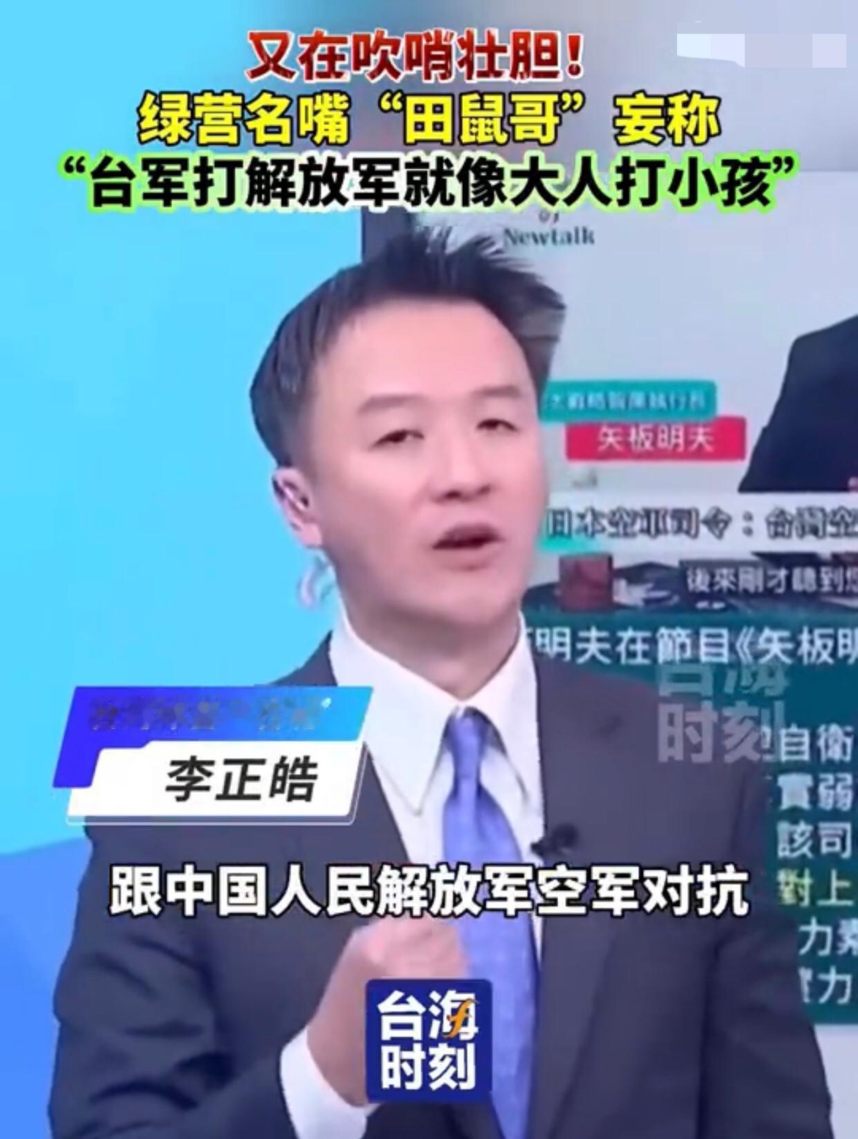 台湾‘田鼠哥’李正皓表示:“如果台湾的军人、尤其是空军,跟大陆解放军空军对抗时,在空中发生缠斗的话,就会像是‘大人打小孩一样‘,也就是说,‘台军打解放军就像大人打小孩‘,是‘拳击运动员跟高中生打架‘的逻辑。” 其他台湾岛内人附和道:“台湾的飞行员是‘精锐的职业军人’,因此,其实台湾的空军是具有‘显著优势’的。”