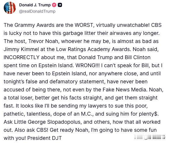 特朗普:特雷弗·诺亚发表了关于我的错误言论,称特朗普和比尔·克林顿曾在爱泼斯坦岛上待过。错误! 我不能代表比尔发言,但我本人从未去过爱泼斯坦岛,也从未接近过那里;直到今晚这则虚假且具有诽谤性的言论出现之前,我从未被指控去过那里——甚至从未被“假新闻媒体”指控过。 诺亚这个彻头彻尾的失败者,最好把事实搞清楚,而且要迅速纠正。看来我要派我的律师去起诉这个可怜、可悲、毫无才华、愚蠢透顶的主持人,并且要狠狠让他赔偿一大笔钱。