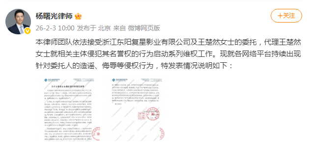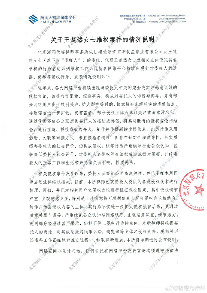 【#王楚然委托律师告黑#】#王楚然维权# 据:本律师团队依法接受浙江东阳复星影业有限公司及王楚然女士的委托,代理王楚然女士就相关主体侵犯其名誉权的行为启动系列维权工作。现就各网络平台持续出现针对委托人的造谣、侮辱等侵权行为,特发表情况说明如下。