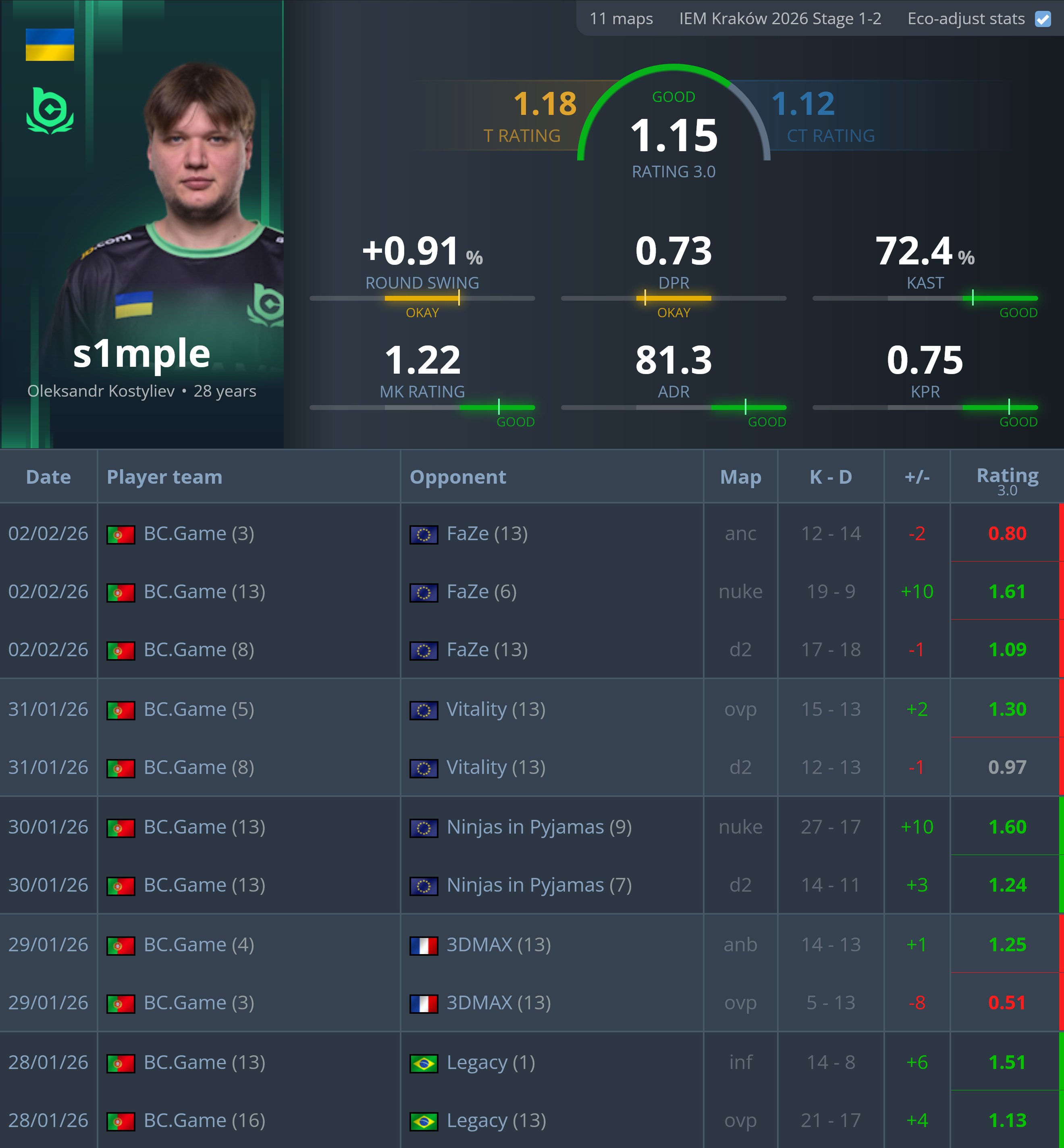 本次赛事,s1mple从第一阶段入围赛开始打起,总计出战11张地图,场均能够贡献1.15Rating,帮助队伍取得2胜3负。