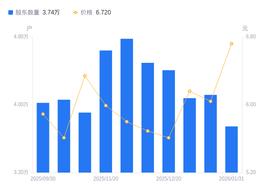 日期A股户数(户)流通A股户均持股数(股)户均持股市值(万元)2026-01-313744026019.6817.492026-01-204116023668.0514.302026-01-104078023888.5914.722025-12-204407422103.2112.402025-12-104494021677.2812.332025-11-304778320387.5211.822025-11-204639720996.5512.582025-11-103907624930.3115.812025-10-204058324004.5513.472025-09-304021924221.8114.27