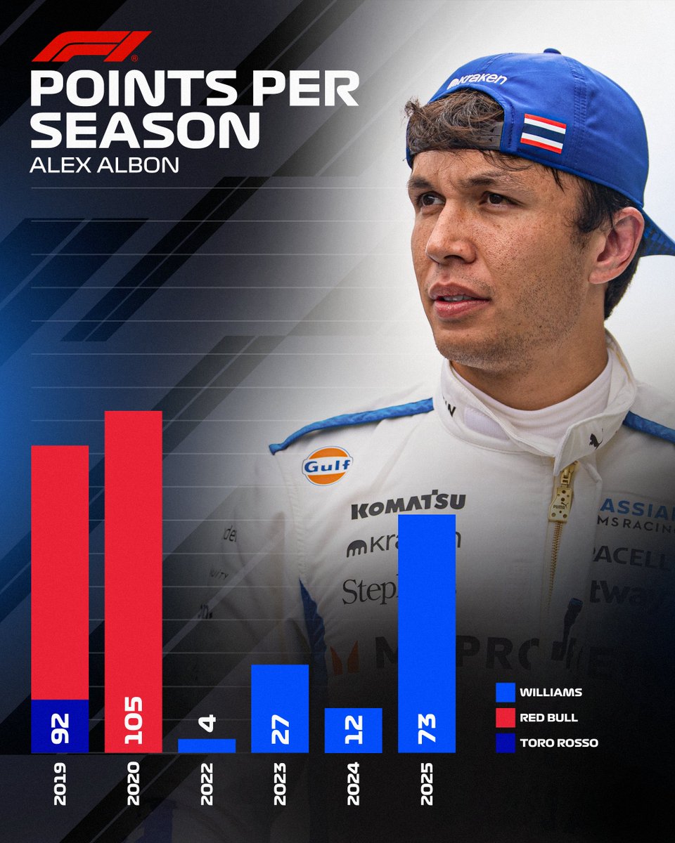 F1官方近日发文盛赞威廉姆斯车队车手亚历克斯·阿尔本的职业生涯轨迹。这位泰国车手经历了戏剧性的职业起伏:2019年作为红牛二队车手进入F1,2020年被提拔至红牛一队,但因表现未达预期,2021年被降级为测试车手,整个赛季只能坐在场边观战。2022年,阿尔本迎来转机,加盟威廉姆斯车队重获正式车手席位。经过不懈努力,他在2023-2024赛季多次为车队斩获宝贵积分,展现出色的竞技状态和职业精神,完成了令人瞩目的职业生涯救赎。F1官方推特评价道:'很少有F1车手能像亚历克斯·阿尔本这样经历如此完整的人物成长弧线。'目前,阿尔本已确认将继续代表威廉姆斯车队征战2026赛季。