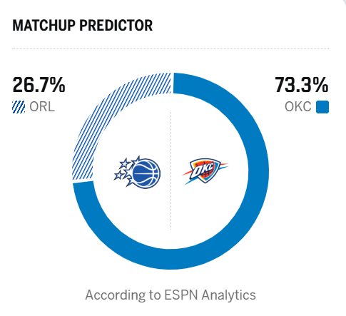 ESPN预测明日比赛:雷霆胜率73.3%,魔术胜率26.7%