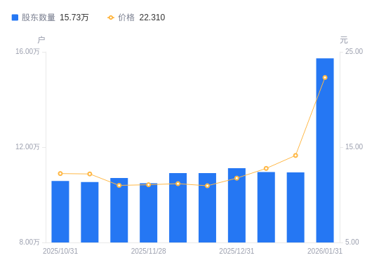 日期A股户数(户)流通A股户均持股数(股)户均持股市值(万元)2026-01-311572847688.4017.152026-01-2010944111049.4515.612026-01-0910954411039.0614.102025-12-3111117710876.9112.782025-12-1910908711085.3112.142025-12-1010908710391.9211.612025-11-2810487910602.2811.732025-11-2010704510387.7511.422025-11-1010538310346.2012.612025-10-3110578710306.6912.61