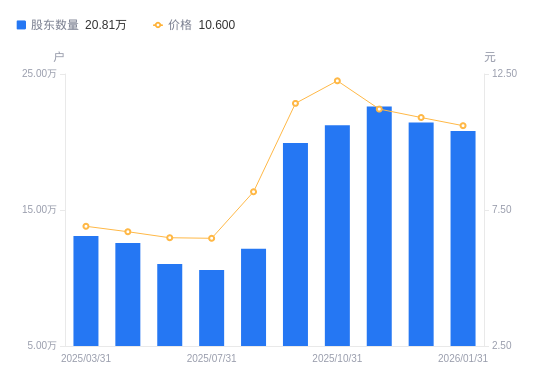 日期A股户数(户)流通A股户均持股数(股)户均持股市值(万元)2026-01-312080988896.759.432025-12-312142578633.489.412025-11-302260958153.659.142025-10-312123088618.3910.562025-09-301993269180.1310.482025-08-3112144515067.2212.312025-07-3110582717285.0611.172025-06-3011025016591.6210.752025-04-3012574714546.649.752025-03-3113096613966.819.64