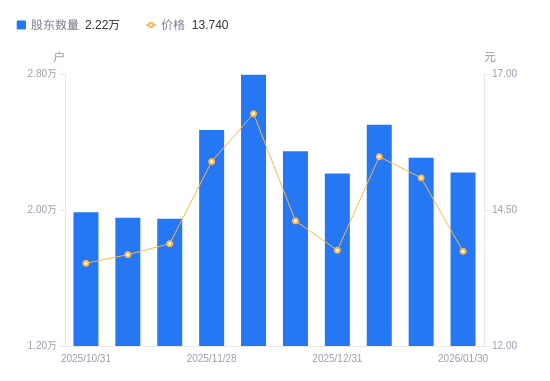 日期A股户数(户)流通A股户均持股数(股)户均持股市值(万元)2026-01-30222019963.3213.692026-01-20230749586.3614.472026-01-09250098844.6413.692025-12-31221519985.8013.742025-12-19234529431.8413.492025-12-10279587911.7112.872025-11-28247128950.9413.782025-11-201949011349.1815.752025-11-101954711316.0915.482025-10-311987111131.5815.05