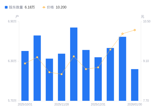 日期A股户数(户)流通A股户均持股数(股)户均持股市值(万元)2026-01-306180011488.9011.722026-01-206670010644.8910.722026-01-096500010923.3010.392025-12-316360011163.759.912025-12-196470010973.959.682025-12-106810010426.059.662025-11-286414011069.769.562025-11-206339011200.739.762025-11-106689110614.509.812025-10-316454611000.139.92