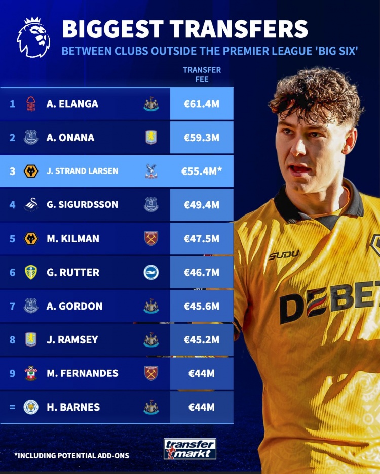 直播吧2月4日讯英超传统BIG6在转会市场上能够花费大量资金进行引援,非BIG6球队的转会运作经常是量入为出,但他们也偶尔会豪掷资金引进心仪的球员。德国转会市场盘点了英超非BIG6引援身价排行情况,伊兰加以6140万欧元居首,水晶宫新援拉尔森有望成为历史第三(含浮动费用)。