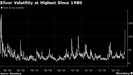按波动性指标衡量,黄金价格的波动性已达到2008年金融危机高峰以来的最高点。与此同时,白银市场经历了自1980年以来最剧烈的市场动荡。