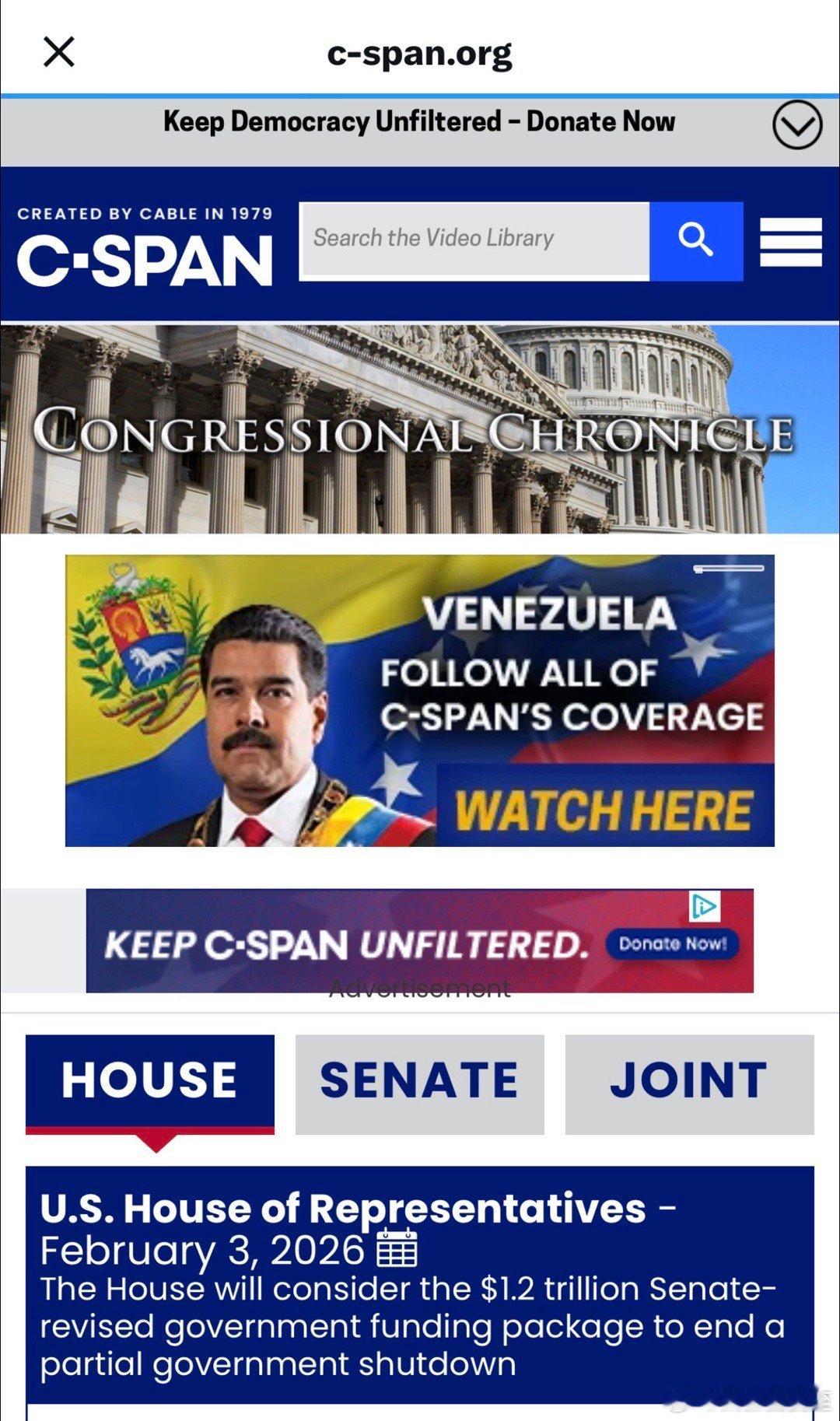众议院已经开始正式投票现场直播的网站,主页是“委内瑞拉局势分析”广告,马杜罗形象