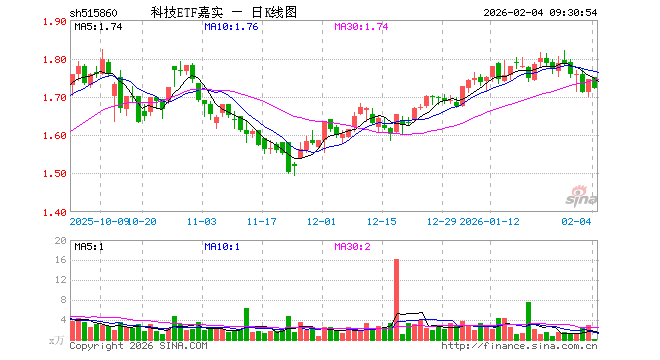 2月4日,科技ETF嘉实(515860)开盘涨0.29%,报1.750元。科技ETF嘉实(515860)重仓股方面,海康威视开盘跌0.78%,迈瑞医疗跌0.09%,华勤技术跌0.74%,鹏鼎控股跌0.86%,中际旭创跌3.34%,生益科技跌2.03%,豪威集团跌0.95%,深南电路跌1.45%,北方华创跌1.05%,新易盛跌4.45%。