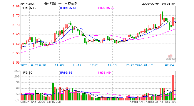 2月4日,光伏ETF国泰(159864)开盘跌0.81%,报0.732元。光伏ETF国泰(159864)重仓股方面,特变电工开盘跌0.34%,隆基绿能跌0.92%,阳光电源涨0.08%,TCL科技跌0.63%,通威股份涨0.11%,迈为股份涨0.60%,德业股份跌0.45%,正泰电器跌1.00%,TCL中环涨0.10%,捷佳伟创涨1.45%。