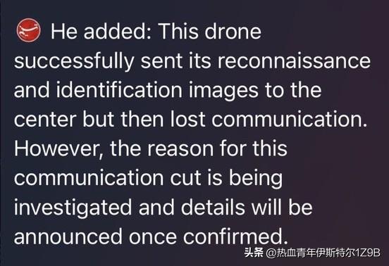 隶属于伊朗伊斯兰革命卫队(IRGC)的伊朗官方通讯社塔斯尼姆通讯社证实,今天早些时候,一架沙赫德-129侦察无人机在阿拉伯海上空失踪。该通讯社称,无人机失踪的原因“正在调查中”,但无人机在与伊朗地面中心失去联系之前,已经能够传输其侦察和识别图像。