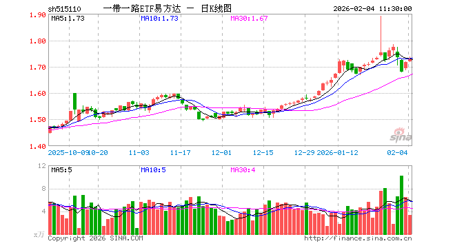 2月4日,截止午间收盘,一带一路ETF易方达(515110)涨0.64%,报1.727元,成交额581.83万元。一带一路ETF易方达(515110)重仓股方面,小商品城截止午盘跌0.46%,金风科技涨0.18%,中国铝业涨0.91%,烽火通信跌4.70%,东阿阿胶涨3.46%,南网能源涨1.21%,广东宏大跌4.17%,云铝股份跌0.06%,建设银行涨0.23%,中国联通涨0.21%。