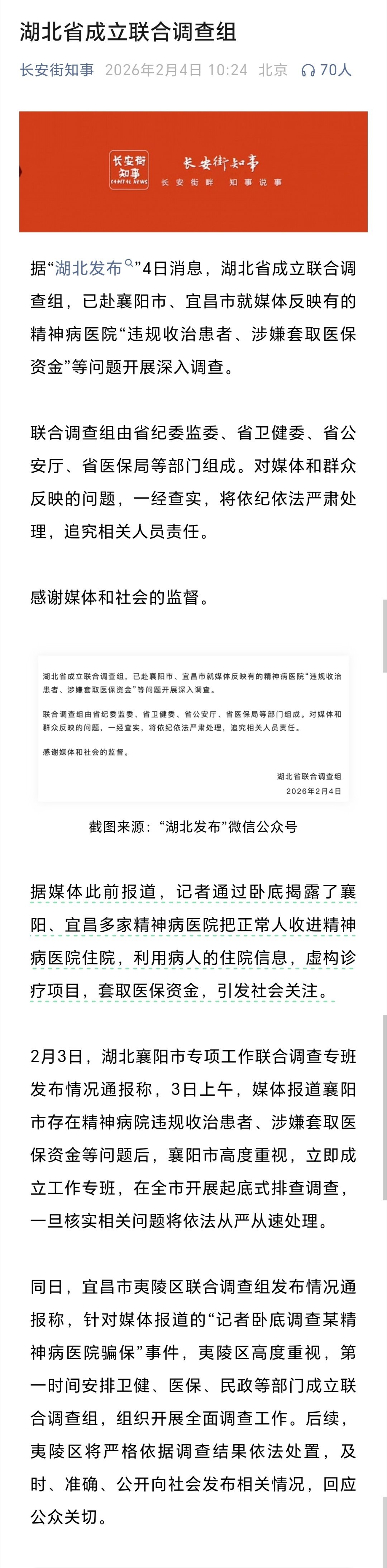 湖北成立联合调查组赴襄阳宜昌据“湖北发布”,湖北省成立联合调查组,已赴襄阳市、宜昌市就媒体反映有的精神病医院“违规收治患者、涉嫌套取医保资金”等问题开展深入调查。