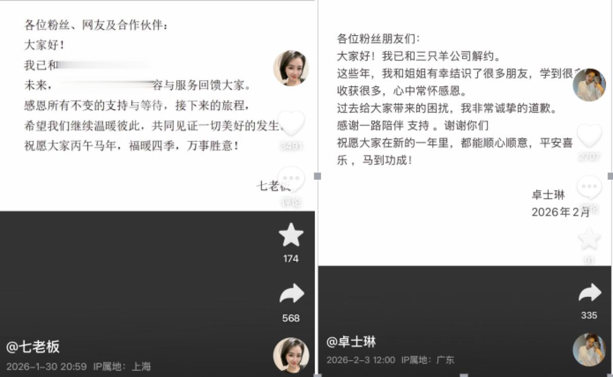 2月4日,大河报《看见》记者获悉,知名带货主播卓士琳、七老板近日公开宣布已与三只羊公司解约。与三只羊旗下其他主播相比,卓士琳、七老板的主页并无“三只羊MCN”的标识,其宣布解约的内容也已关闭评论区。