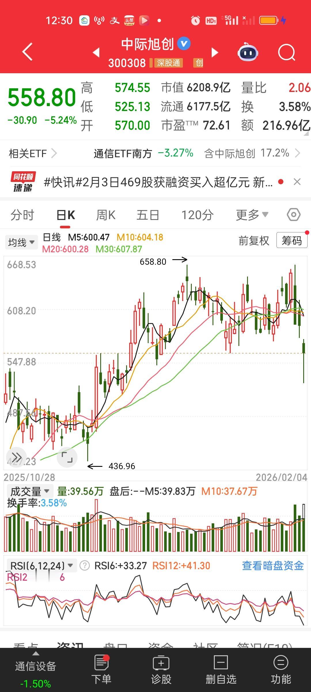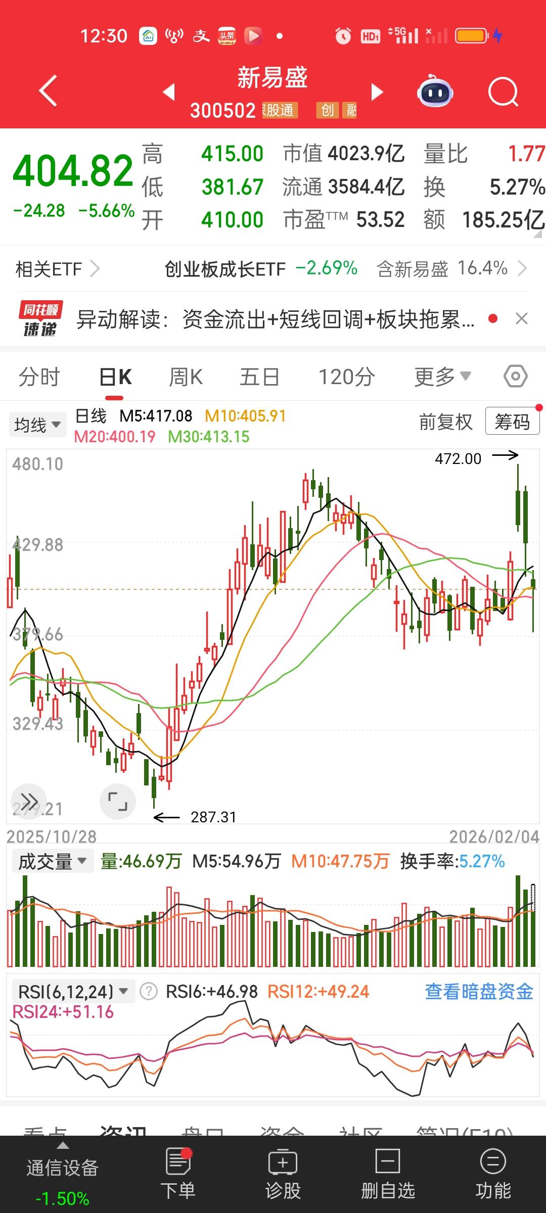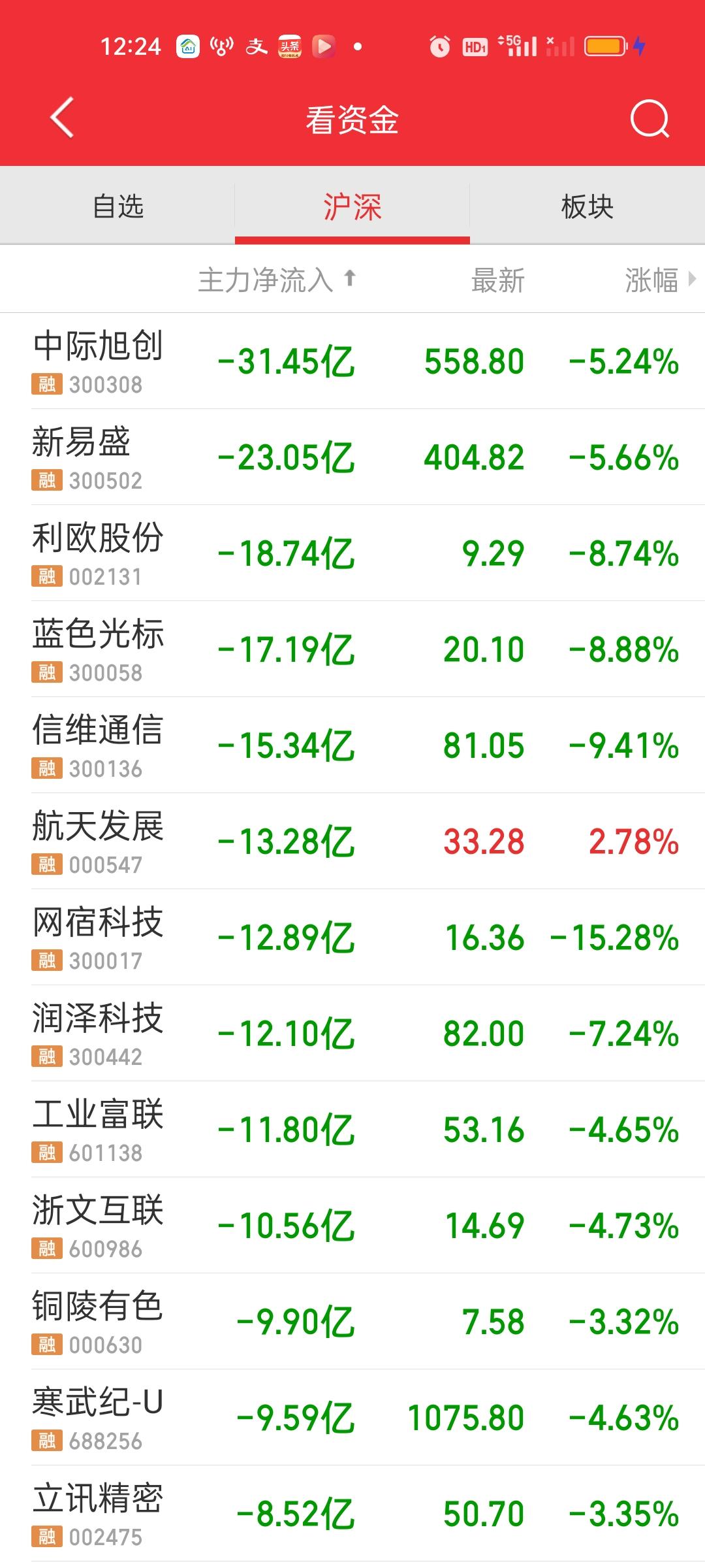 中午收盘了,昨天没有砸盘今天又开始了,从大盘净流出资金就能看出来,昨天是净流入170亿的,而今天一个上午就流出了接近800亿,我们不用猜测是旺旺在砸盘还是机构在砸盘。总之散户是没有这么大的资金量的。 早上我就说了,如果有冲高需要控一控仓位,不知道有没有人在高处减仓了?今天成交量是放量的。但下午未必能维持住放量的状态。CPO的几个大票走势太恐怖了,两三天时间走完了过去2个月走完的路。今天又是资金又是巨幅流出。