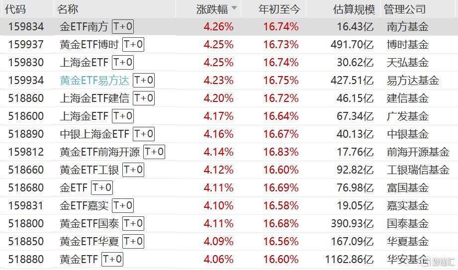 上海金ETF、黄金ETF博时、黄金ETF易方达、金ETF南方、黄金ETF、黄金ETF华夏、金ETF等涨超4%。