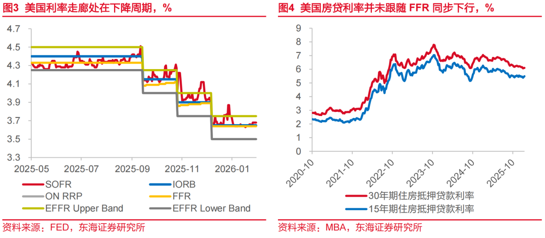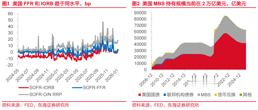 第二,沃什缩表的必要性和操作空间均不高。按照当前美联储持有证券自然到期速度,每月大约有300-350亿美元MBS到期,到2026年年底美联储或累积减持MBS达到3300-3850亿美元,美联储MBS持有量将缩小至1.6万亿美元左右,和2020年3月QE之前规模(1.4万亿美元)相差无几,到2027年年中MBS持有量将收缩至疫情QE前规模,这点可以看出沃什缩表的必要性并不高,更可能结合降息来保持当前自然到期减持速度。同时,市场引申出的第二个疑问:特朗普主导的GSEs(两房机构)2000亿美元MBS购买规模是否能够为沃什腾出缩表空间?我们认为的确有效但同样有限。自特朗普2026年宣布GSEs的2000亿美元MBS购买规模后,我们注意到FFR已经逐渐提升至和IORB同轨同水平(截至2月3日,FFR为3.64%仅比IORB低1bp):而GSEs作为FFR的主要贷方(银行为借方),FFR的中枢性提升已经说明GSEs可待资金逐渐趋紧,如果GSEs后续不进行发债融资,我们认为这2000亿资金可能在沃什上任前后一个月内耗尽(美财长贝森特在1月公开表示,两房购买MBS的主要目的是为了完全对冲美联储的减持量,以此为依据,我们以GSEs每月350亿美元购买额进行计算得到,6个月便可能耗尽),如果沃什强行缩表,可能导致美国金融市场流动性进一步收缩,风险溢价大幅上升,和他所推崇的金融价格稳定相互矛盾,这点来看沃什缩表的操作空间也并不高。