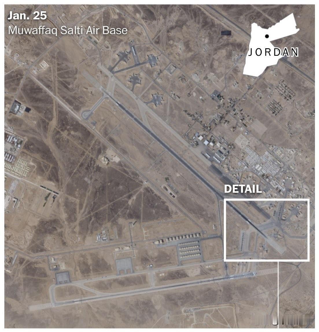 美国《华盛顿邮报》获得的行星实验室,1月25日拍摄的约旦穆瓦法克·萨尔蒂空军基地卫星图像显示,基地停机坪上至少有十余架F-15E“攻击鹰”战斗机和九架A-10C“雷电II”攻击机。 这是美国空军持续在中东地区集结军机、针对伊朗所采取行动的一部分。