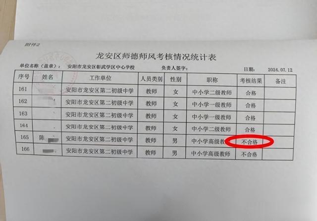 陈先生说,经过再一次调整,他被调至另一所小学。2025年底,学校开展专业技术岗位等级晋升竞聘工作,他在调取资料时,发现2024年他的师德师风考核被定为不合格。他找到龙安区彰武学区中心学校,校方答复称,是区教育局所定。随后,他又找到区教育局,得到的答复是与他和韩某相恋一事有关。
