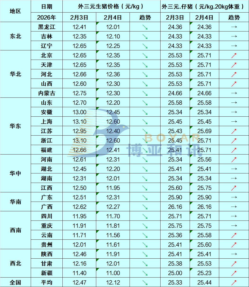 据博亚和讯监测,2026年2月4日全国外三元生猪均价为12.12元/kg,较昨日下跌0.35元/kg;仔猪均价为25.44元/kg,较昨日上涨0.11元/kg;白条肉均价16.68元/kg,较昨日下跌0.24元/kg;今日猪料比为3.63:1,较昨日减少0.10。