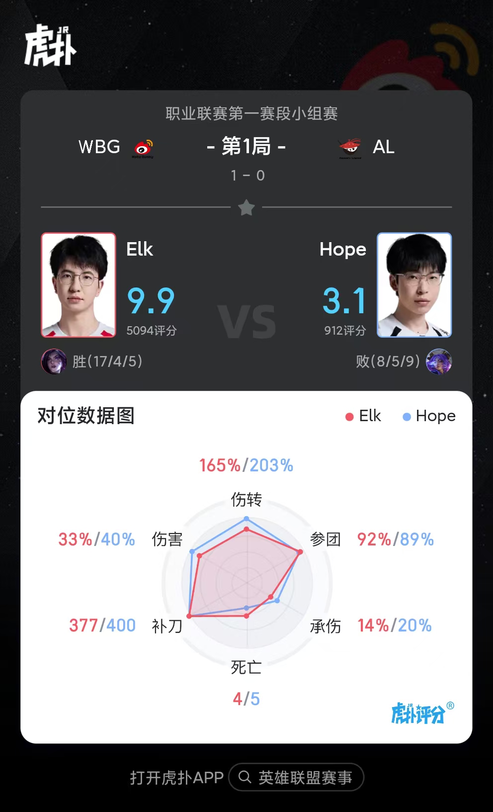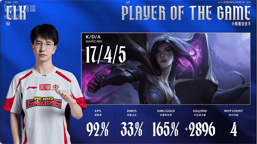 ELK卡莎打出17/4/5战绩,拿到WBG对阵AL首局比赛MVP