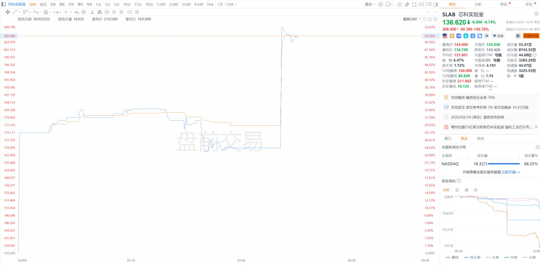 格隆汇2月4日|芯科实验室(SiliconLabs)(SLAB.US)盘前直线拉升,现大涨50%。消息面上,德州仪器已同意以75亿美元收购芯片企业芯科实验室。根据两家公司发布的联合声明,芯科实验室的股东将获得每股231美元的现金。交易预计将在2027年上半年完成。