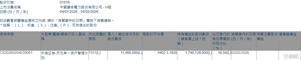 格隆汇2月4日丨根据联交所最新权益披露资料显示,2026年2月3日,中广核电力(01816.HK)获中信证券-开元单一资产管理计划在场内以每股均价3.1835港元增持1146万股,涉资约3648.29万港元。