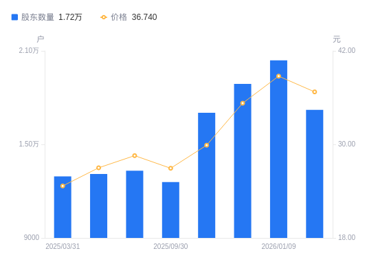 日期A股户数(户)流通A股户均持股数(股)户均持股市值(万元)2026-01-09203915849.9722.672025-12-31188816317.8222.302025-12-10170247006.9720.952025-09-30125909474.7225.522025-08-31133108962.1825.602025-06-30131069101.6824.572025-03-31129477067.0617.432024-12-31121147553.0218.872024-09-30111958173.0517.532024-06-30154345928.2912.75