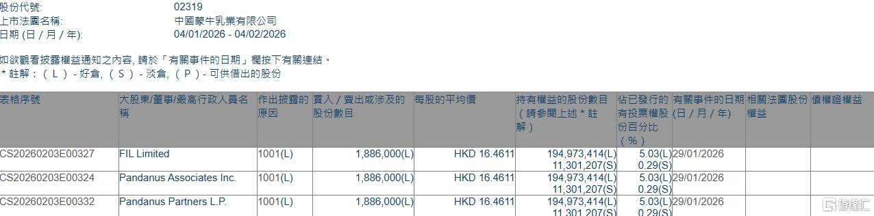 格隆汇2月4日丨根据联交所最新权益披露资料显示,2026年1月29日,蒙牛乳业(02319.HK)获FILLimited在场内以每股均价16.4611港元增持好仓188.6万股,涉资约3104.56万港元。