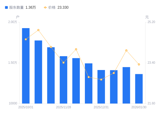 日期A股户数(户)流通A股户均持股数(股)户均持股市值(万元)2026-01-30136257713.9218.002026-01-20144767260.4417.392026-01-09140997454.5817.112025-12-31141157446.1316.872025-12-19149337038.2516.032025-12-10155836744.6616.192025-11-28158146646.1415.562025-11-20169096215.7514.982025-11-10177525920.5814.712025-10-31192655455.6013.33
