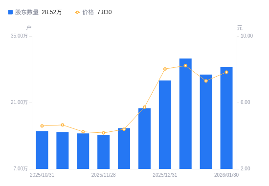 日期A股户数(户)流通A股户均持股数(股)户均持股市值(万元)2026-01-302851704707.983.692026-01-202688194994.343.652026-01-093029884431.113.642025-12-312564665234.904.202025-12-191980246757.433.872025-12-101559848578.653.772025-11-281417509440.093.942025-11-201448539237.873.922025-11-101477359057.664.212025-10-311498758928.334.10