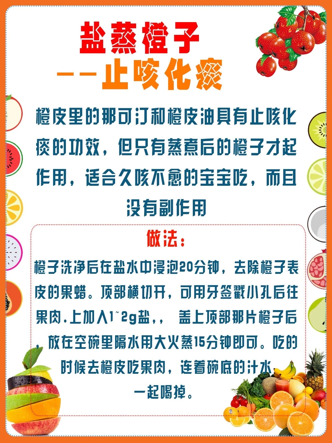 👉做法:橙子一个,水500毫升盐3克,洗干净后,橙子顶部切开,用牙签戳小孔,加入盐1克,盖上顶部,隔水大火炖15分钟,连汤带肉吃完