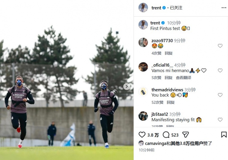皇马后卫阿诺德更新社媒,晒出训练图:首次感受平图斯的训练强度。