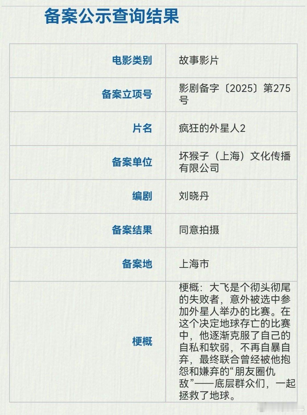 电影《疯狂的外星人2》2027敬请期待前作2019年春节档上映,黄渤、沈腾主演,票房23亿备案:坏猴子编剧:刘晓丹《红毯先生》《疯狂的外星人》《爆款好人》《我和我的祖国》梗概:大飞是个彻头彻尾的失败者,意外被选中参加外星人举办的比赛。在这个决定地球存亡的比赛中,他逐渐克服了自己的自私和软弱,不再自暴自弃,最终联合曾经被他抱怨和嫌弃的“朋友圈仇敌”——底层群众们,一起拯救了地球。