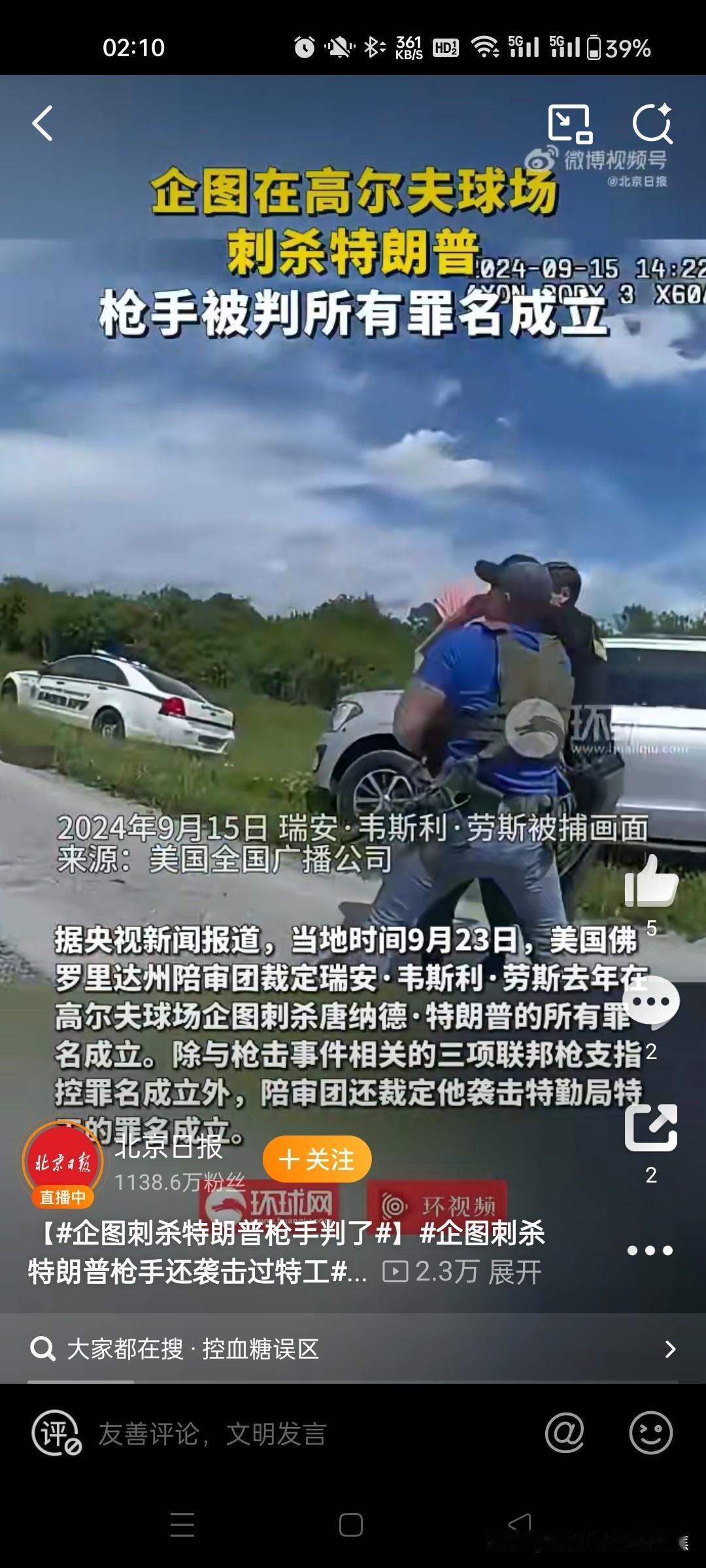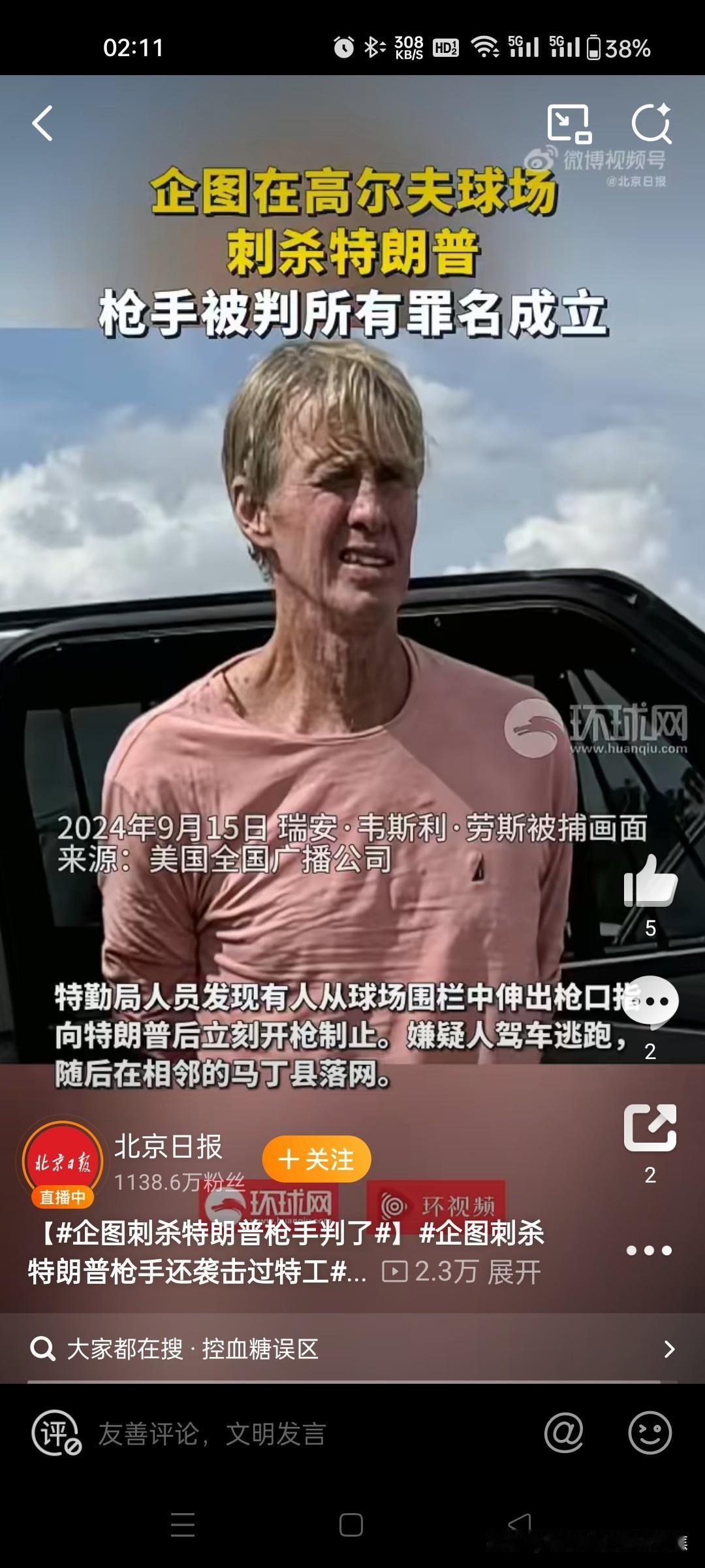 刺杀特朗普,被判终身监禁 当地时间2月4日,美国佛罗里达州联邦法院对试图刺杀美国前总统特朗普的枪手瑞安·韦斯利·劳斯作出终审判决,判处其终身监禁。这一结果终结了此前因劳斯在庭审中当庭自杀未遂引发的戏剧性场面。@红星新闻8红星新闻观察者网 案件核心事实与判决结果 犯罪经过:2024年9月15日,劳斯在特朗普位于佛罗里达州西棕榈滩的高尔夫球场外围埋伏,持配有瞄准镜的AK-47突击步枪通过围栏缝隙指向球场内部,意图刺杀正在打高尔夫的特朗普。特勤局特工在距离特朗普约294-457米处发现其行动后开枪制止,劳斯驾车逃逸后被抓获。现场查获枪支、弹壳及运动相机等证据。@北京日报34 罪名成立:2025年9月23日,佛罗里达州陪审团裁定劳斯所有罪名成立,包括三项联邦枪支犯罪及一项袭击特勤局特工罪。依据美国法律,数罪并罚最高可判终身监禁。27 终审判罚:2026年2月4日,联邦法院正式判处劳斯终身监禁。法院未采纳任何减刑理由,强调其行为是“针对国家政治人物的蓄意暴力”。17北京日报央视新闻环球时报 庭审中的突发事件 当庭自杀未遂:在2025年9月宣判罪名成立后,劳斯情绪失控,当庭用钢笔猛刺自己颈部试图自杀。法警迅速介入将其制服并拖离现场,经急救后无生命危险。其女儿在旁听席哭喊“他想自杀!”,并指责司法系统“被操纵”。@观察者网7 后续处置:为防止再次自残,劳斯出庭时被佩戴镣铐并移除可能用于自杀的物品。法官指出其行为进一步证明“对社会安全的持续性威胁”。8 案件背景与社会反响 犯罪历史:劳斯此前有多次犯罪记录,包括2002年非法持有机关枪、肇事逃逸、拒捕等。其激进政治立场(如对俄乌冲突的极端态度)及民主党背景引发舆论关注。2 政治暴力频发:此次刺杀未遂是特朗普在两个月内遭遇的第二起袭击(前次为2024年7月竞选集会枪击事件)。美国媒体批评此类事件反映“政治暴力常态化”趋势。@环球时报2 司法争议:尽管劳斯被重判,但同期另一起涉特朗普的加州持枪案嫌疑人仅以5000美元保释获释,凸显美国司法系统对同类案件量刑标准的差异。56环球时报新浪新闻 案件延伸影响 此案成为美国恢复死刑后首例针对政治人物的未遂刺杀重判案例。法学界认为,判决传递联邦法院对政治暴力的“零容忍”信号,但舆论对枪支管控漏洞及政治极化下安全风险的争议仍在发酵。16
