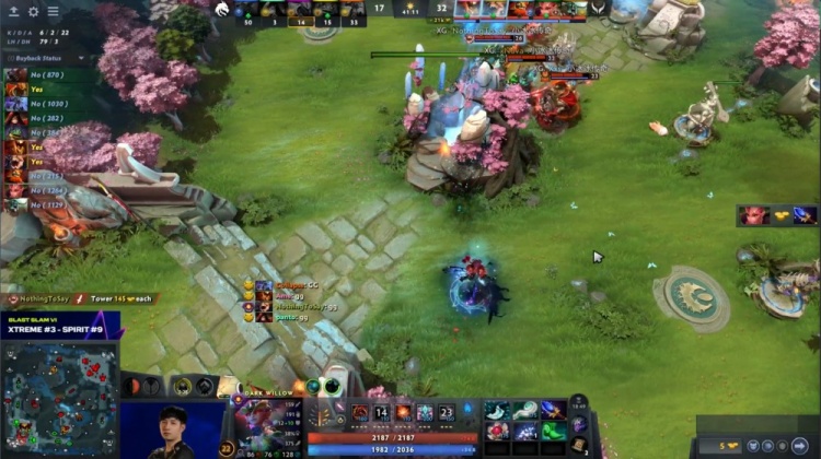 前期rue朗戈上中两路游走得手,上路团战XG打出2换3,fy花仙子喜提双杀后,回到下路配合X哥逮捕Yatoro拍拍,NTS獸也来下路配合队友逮捕Yatoro,但Spirit众人支援到位击杀哥哥与xNova,哥哥复活后下路再次被逮捕送出人头,双方经济持平。